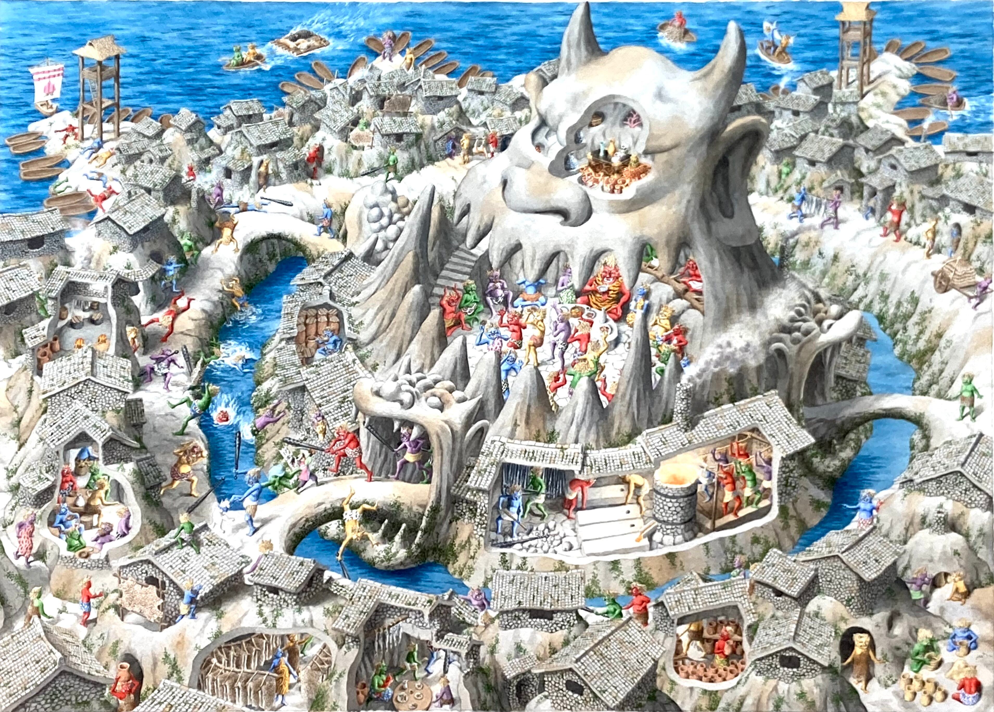 桃太郎が乗り込んで戦っているシーンの他、鬼たちの日常生活も想像再現しました。
